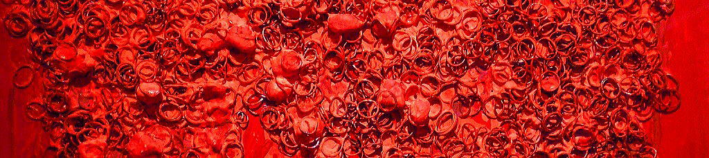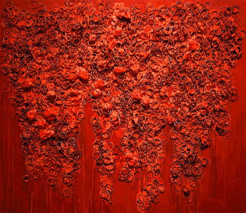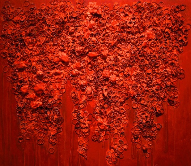 固な意志で侵入を拒絶する女性器を表現。 「女性が生涯に流す血液と内部組織、人間の主要臓器と脳、これが有るために起きる喜びと虐待〈子宮・卵巣・膣〉を形にした」 展示タイトルWOMON2は、1997年イギリス映画プリーチング(Preaching to the Perverted)での女のセリフ「[私はWOMANじゃない、私はWOMON。男は誘わない」か ら。 トニオ(東京在住) |